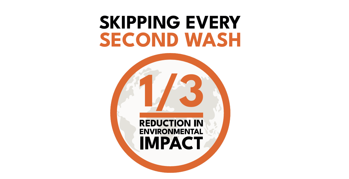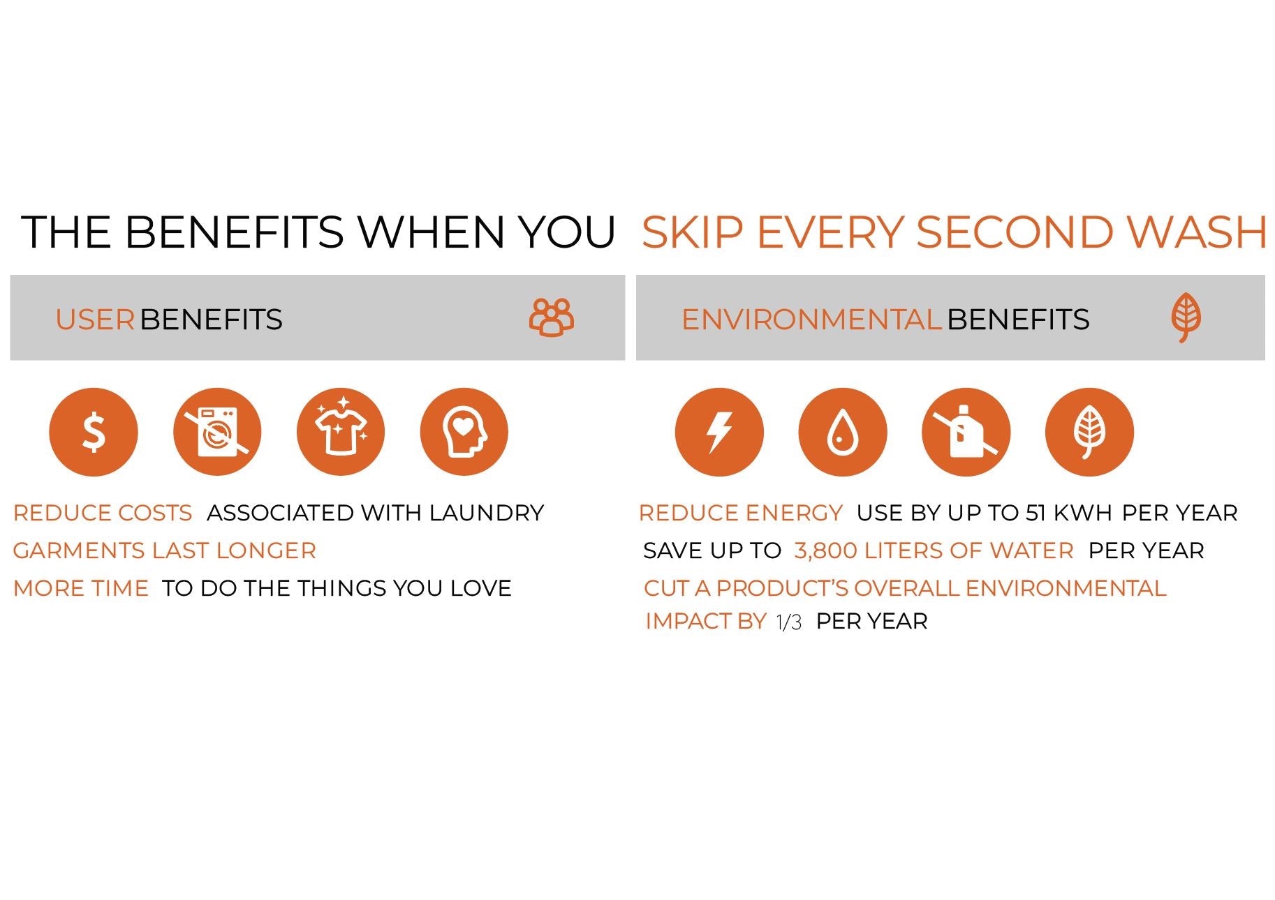 - Less frequent washing reduces energy and water consumption. Skipping every other wash can save 51 kWh and 3,800 liters of water a year – for more information have a look at the recently published LCA (by SWECO).