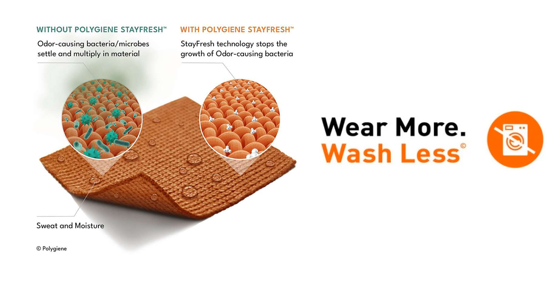 Polygiene StayFresh™ isn’t on stuff. Polygiene is IN stuff. So it remains effective for the useful lifetime of the garment.
