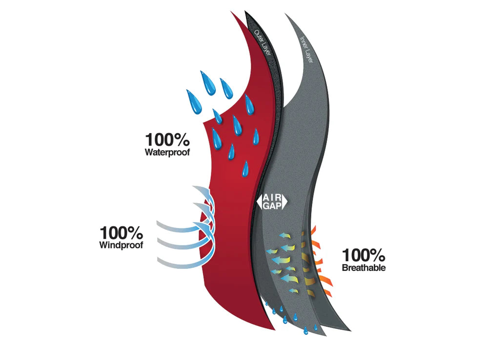With this 2-layer system, an “Air Gap” is created which helps to build warmth, allowing for the body’s temperature to be regulated, minimising shivering when inactive.